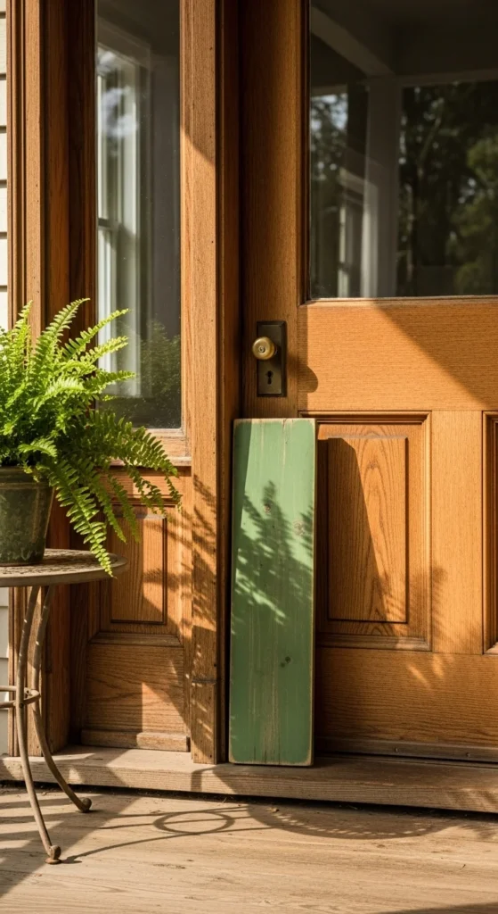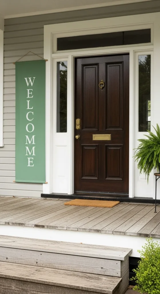 A vertical fabric banner adds color without clutter. Use cotton or linen fabric in green tones and hang it beside the door using removable hooks.