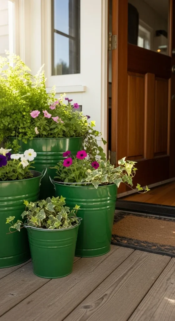 Use green buckets as planters. Place them near the entry or along the porch edge.