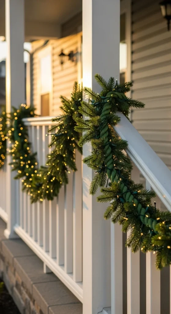 Drape a green garland along porch railings or around columns. Keep it loose so it feels natural.
