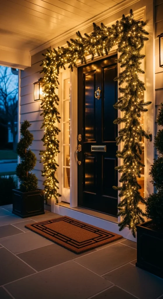 Frame the door with greenery for a festive outline. Keep garland slim so it does not overpower the entry.
