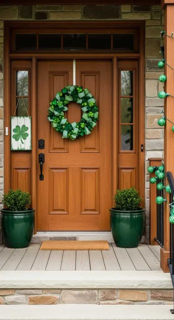 A green front door wreath is one of the easiest ways to decorate your porch for St Patrick’s Day. You can use faux greenery, fabric strips, or felt shapes attached to a basic wreath form. Keep the design loose rather than tightly packed so it feels relaxed and friendly.