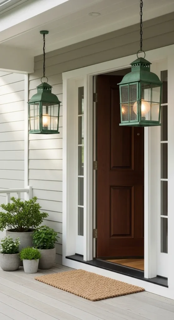This setup works well for small porches because it adds height without taking up walking space. It also creates a welcoming frame around your entry.