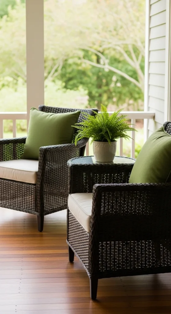 This keeps the porch calm and uncluttered. It’s perfect for small spaces or minimal styles.