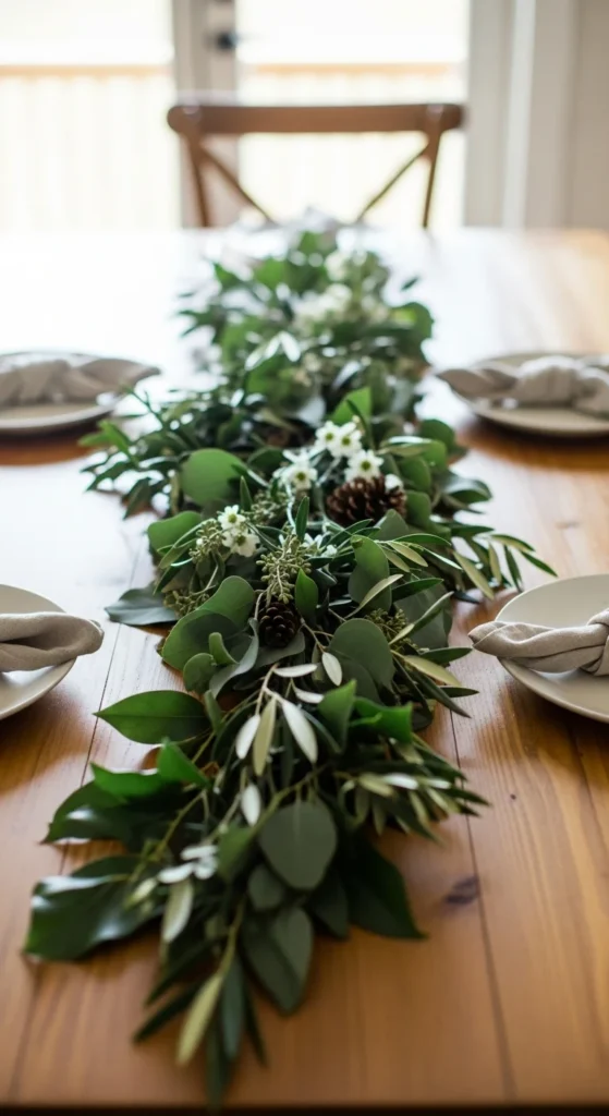 A low greenery garland pulls the table together without blocking views. Use faux or real greenery and lay it loosely down the center.