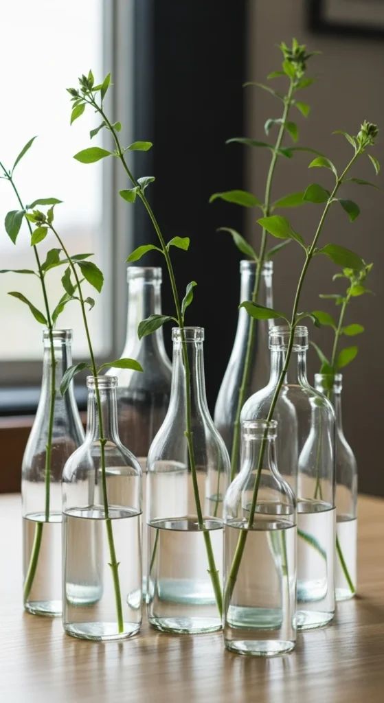 Reuse glass bottles as mini vases. Place one green stem in each bottle and line them along the table.