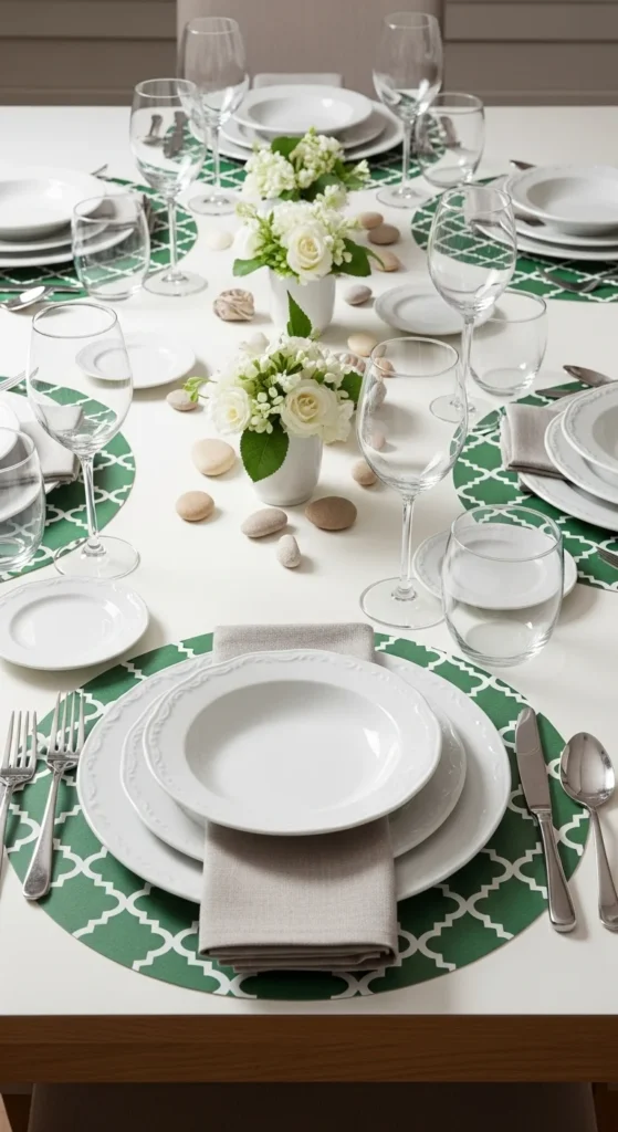 Lay the runner down the center of the table or slightly off-center for a relaxed look. Pair it with white or neutral plates so the green color stands out naturally. This approach keeps the table calm and uncluttered.