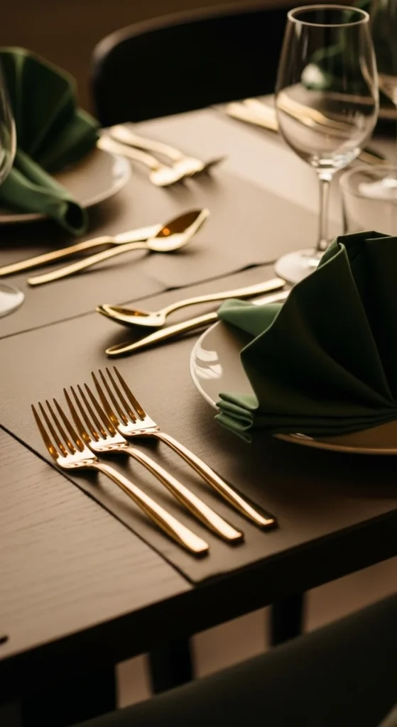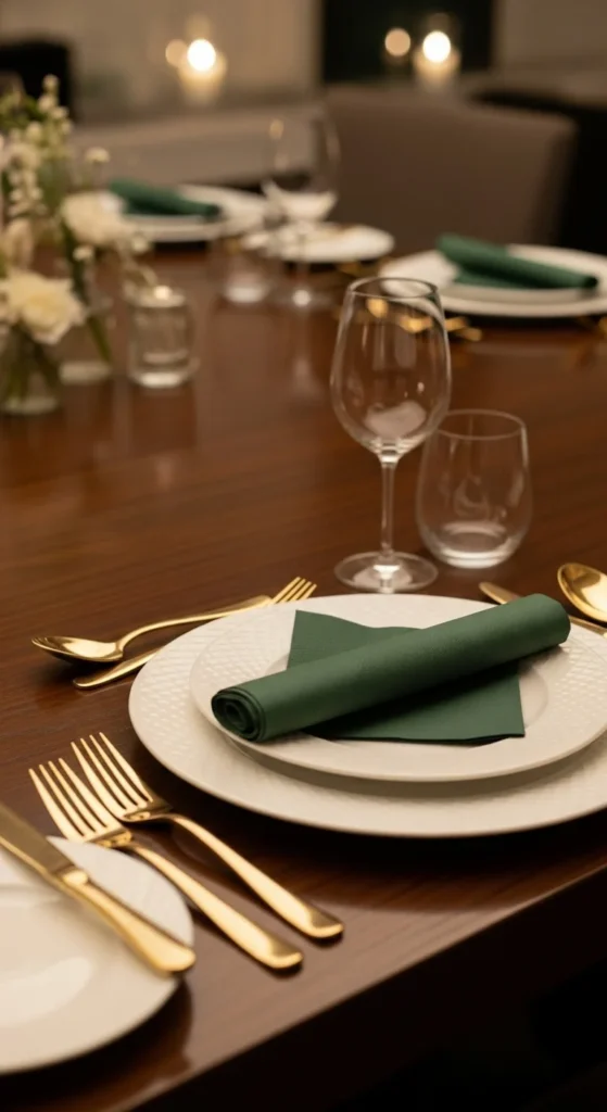 Gold or brass-toned cutlery pairs beautifully with green napkins. Keep plates and glassware neutral so the colors stand out.