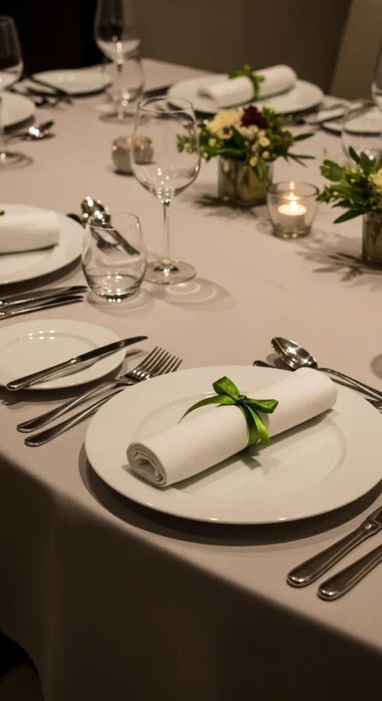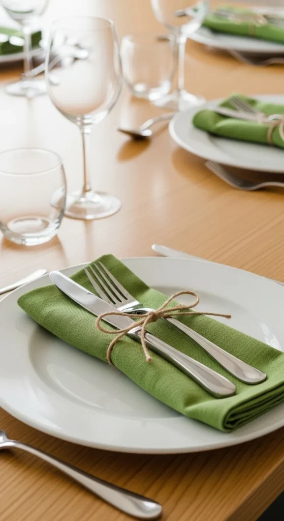 Wrap cutlery inside green napkins and tie with twine or ribbon. This keeps place settings tidy and adds instant color.