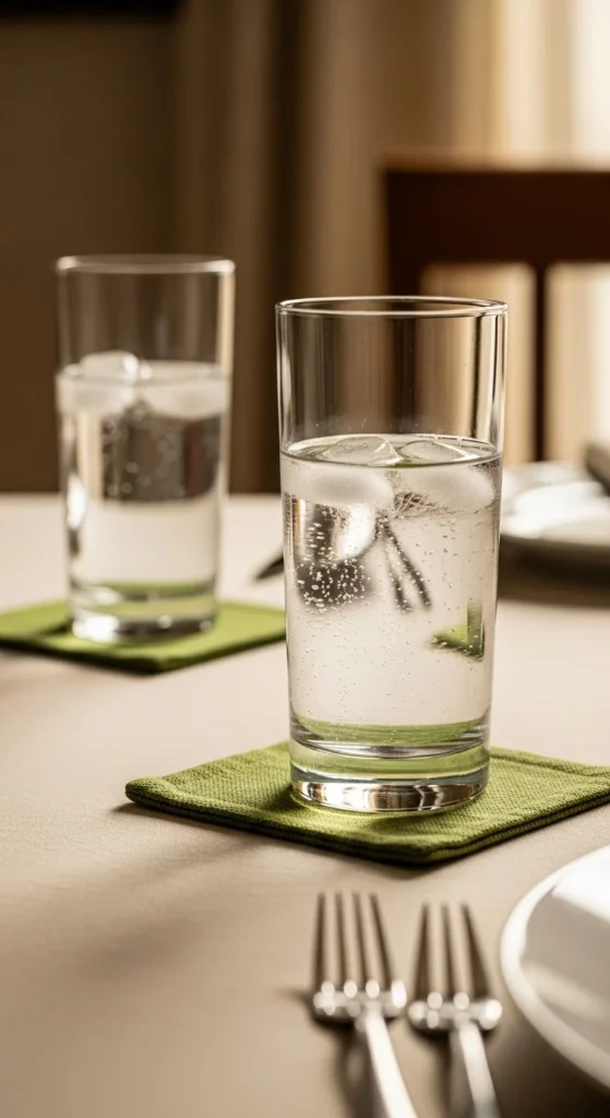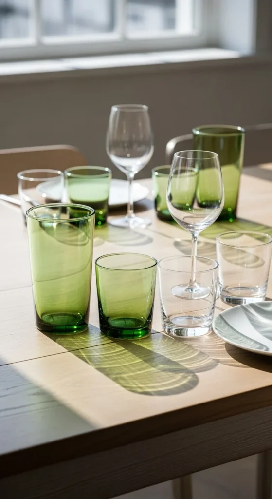 Alternate green and clear glasses for a subtle color pattern. This keeps the table interesting without extra decor.