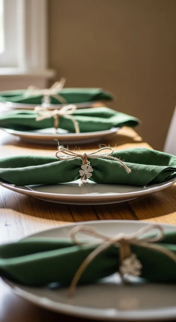 Twine-tied napkins add a handmade feel with very little effort. Fold cloth or paper napkins neatly and tie them with natural twine. Add a small clover charm cut from green cardstock or felt for a festive detail.