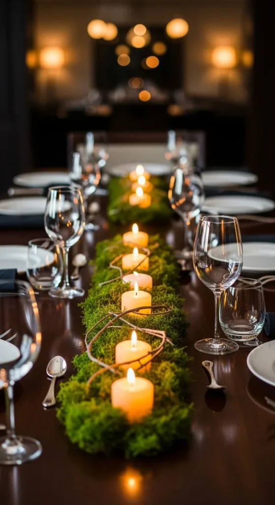 Lay moss down the center of the table and add small candles. Keep everything low and spaced out.