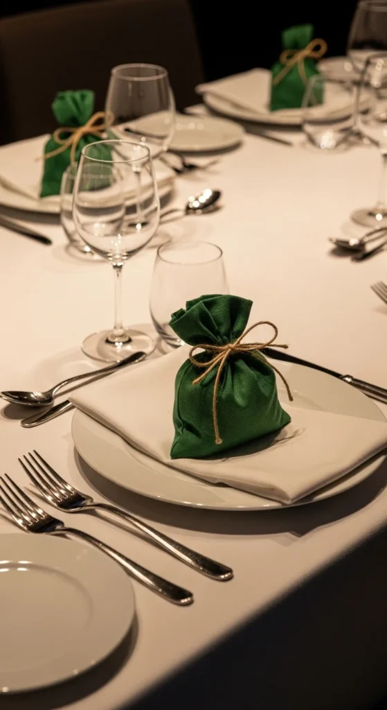 Quality paper napkins can still look thoughtful. Choose a solid green shade and fold them neatly. Simple folds look cleaner than complex shapes.