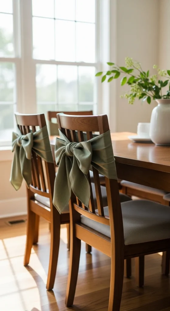 Add green fabric ties to chair backs for extra color beyond the tabletop. Use ribbon, fabric strips, or scarves.