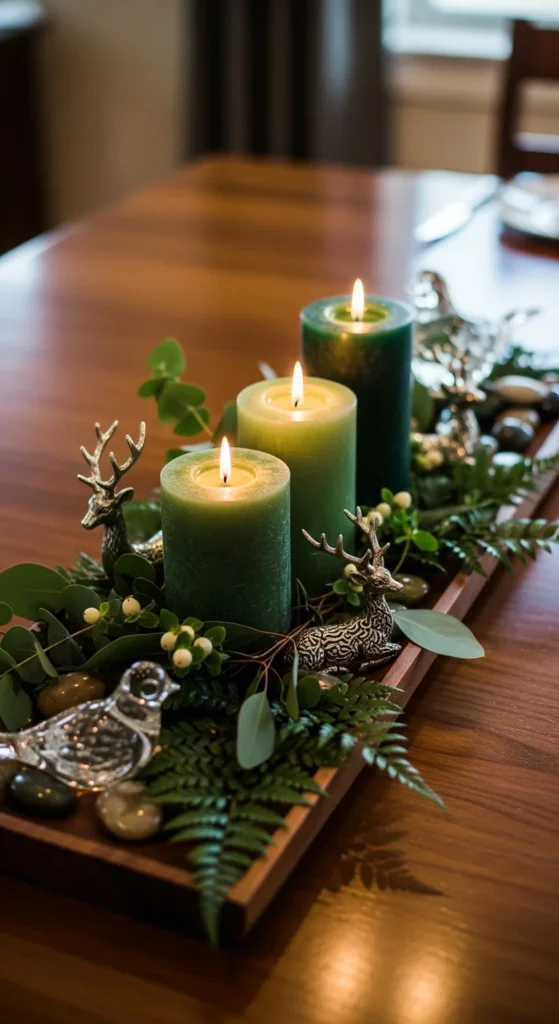 A center tray keeps decor contained and organized. Use a wooden or neutral tray and fill it with green candles, greenery, or small accents.