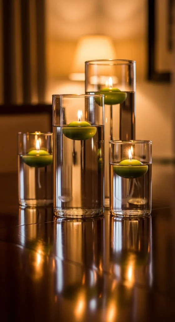 Green tea light holders add warmth without taking up much space. You can use clear glass holders and lightly paint the outside with washable green paint or glass paint. Keep the color soft so the candlelight still shows through.