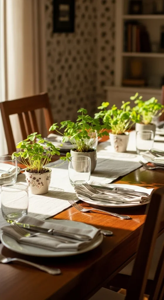 A soft green fabric runner instantly sets the St Patrick’s Day mood without overpowering the table. You can cut fabric from a craft store, reuse a scarf, or repurpose a lightweight curtain panel. Linen, cotton, or muslin works well and does not require sewing. Slightly raw edges actually help it feel handmade rather than formal.
