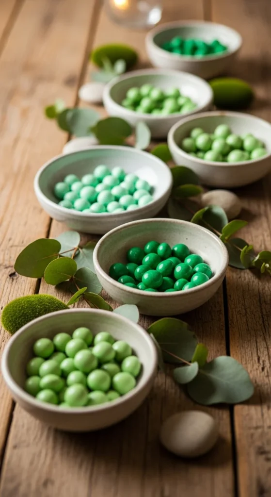 Small bowls filled with green candies add color and function. Choose simple glass or ceramic bowls and keep portions small.