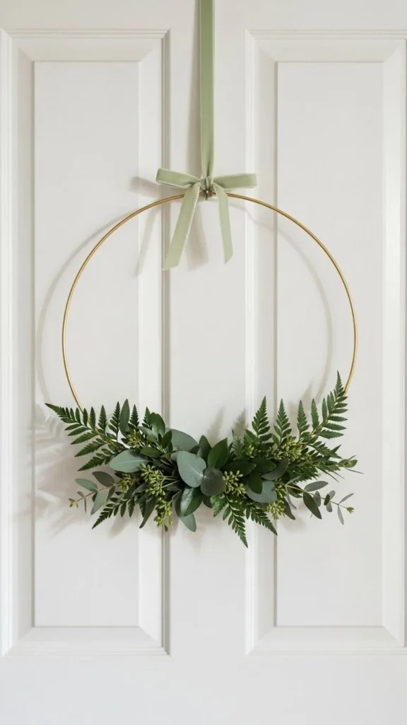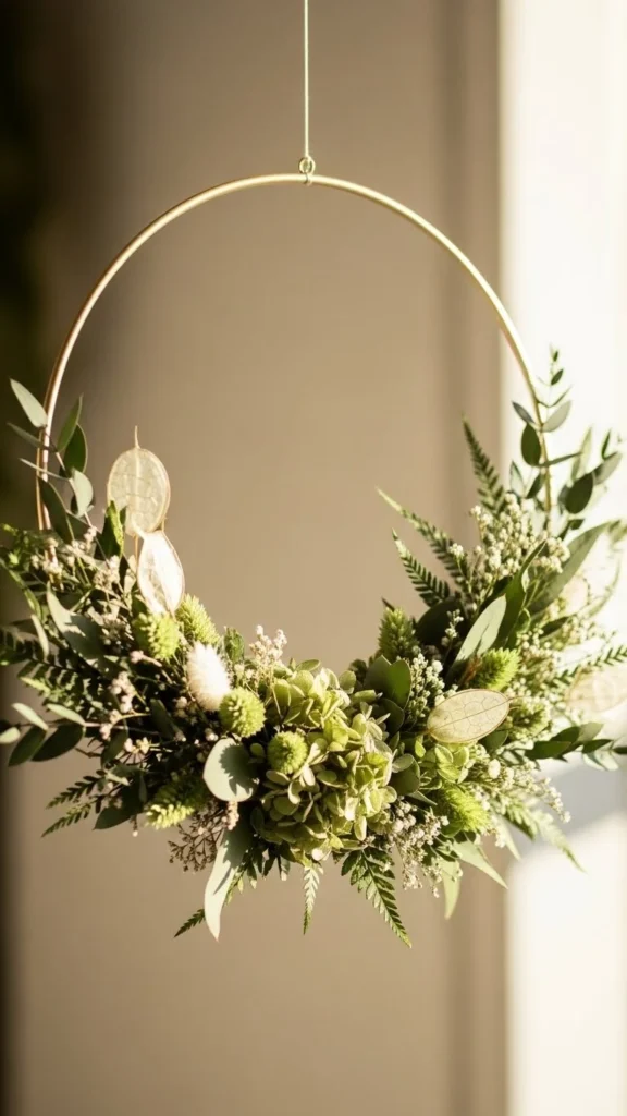 Hoop wreaths feel light and modern. Use a metal hoop as the base and attach faux or dried greenery to one side only. This asymmetrical style feels relaxed and works well for early spring.