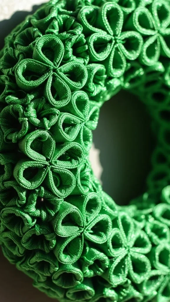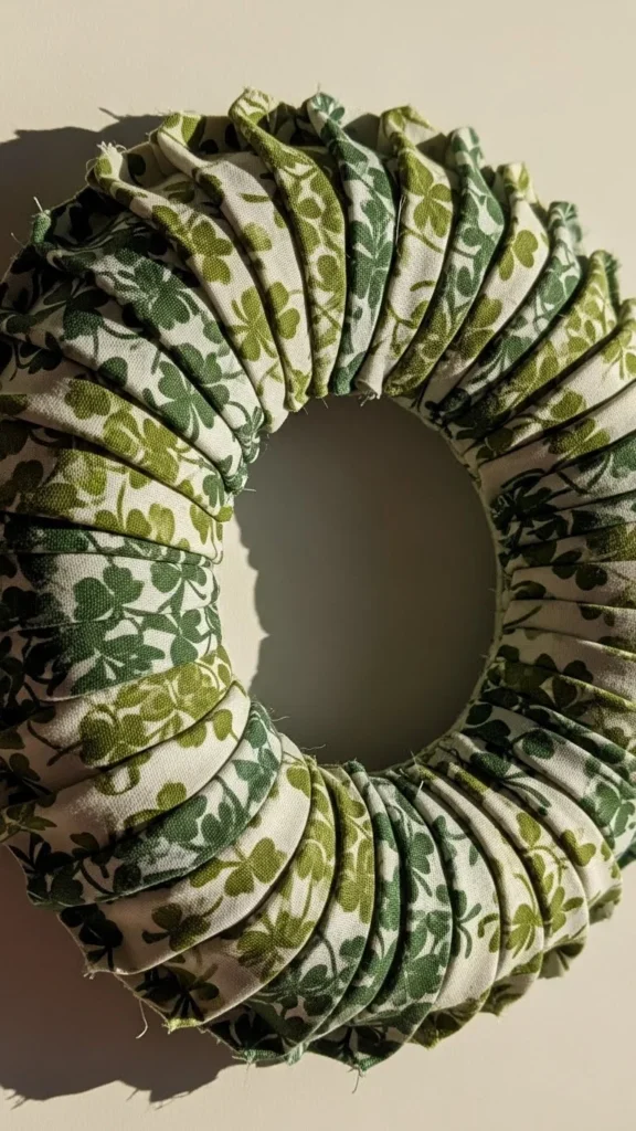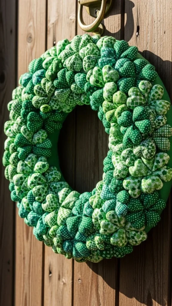 Fabric wreaths feel soft and reusable. Cut shamrock shapes from cotton or linen fabric in different green shades.