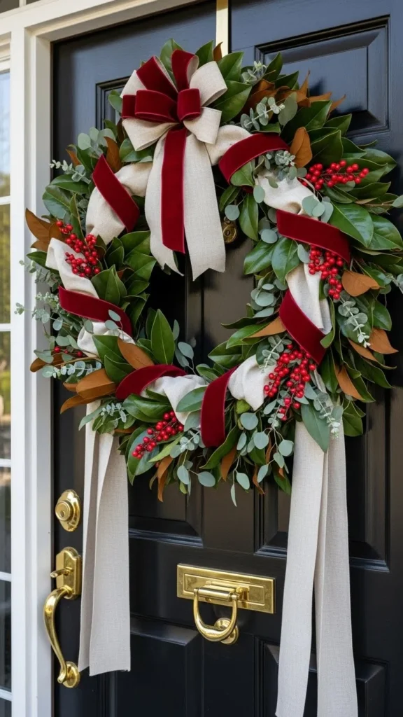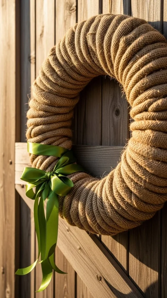 Burlap wreaths offer texture and warmth. Wrap burlap ribbon around a wire frame and fluff sections.