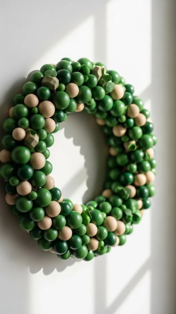 Wood bead wreaths feel simple and clean. String beads onto wire or strong cord, alternating green and natural tones.