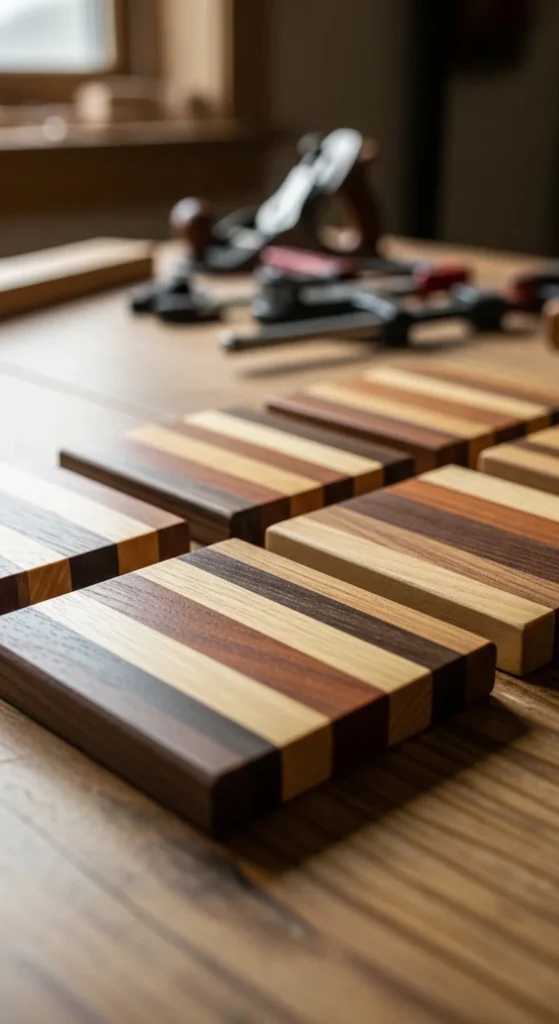 Mixing different wood types creates attractive patterns. Light and dark boards together make each coaster unique.