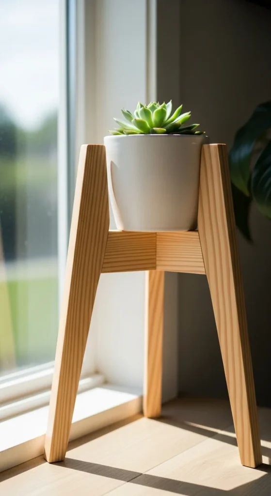 A wooden plant stand adds height and style to houseplants while introducing simple furniture building.
