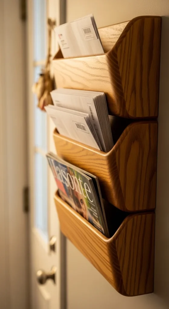 A wooden mail organizer keeps paper clutter from piling up on counters.