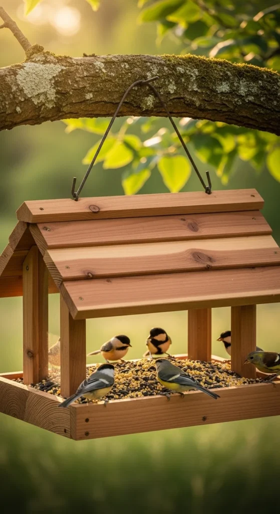 Once hung in a tree or on a porch beam, fill the tray with birdseed.